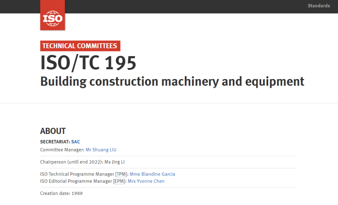 經國際標準化組織(ISO)TMB同意,自2020年5月1日起,ISO/TC195國際標準化組織建筑施工機械與設備技術委員秘書處由中國(SAC)獨立承擔,秘書處承擔單位為北京建筑機械化研究院有限公司,北京建筑機械化研究院有限公司劉雙任ISO/TC195委員會經理(原稱為秘書),李靜任ISO/TC195主席(2020年-2022年)。
